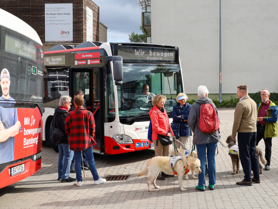 Am 17. September 2025 konnten BBSB-Mitglieder die neuen Busse mit Zusatzfunktionen für mehr Barrierefreiheit auf dem Betriebshof der Verkehrsbetriebe ausführlich ertasten.