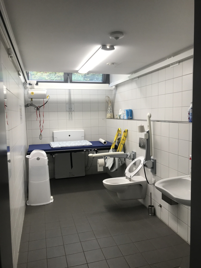 (Behindertentoilette mit Pflegeliege und Personen-Lifter)